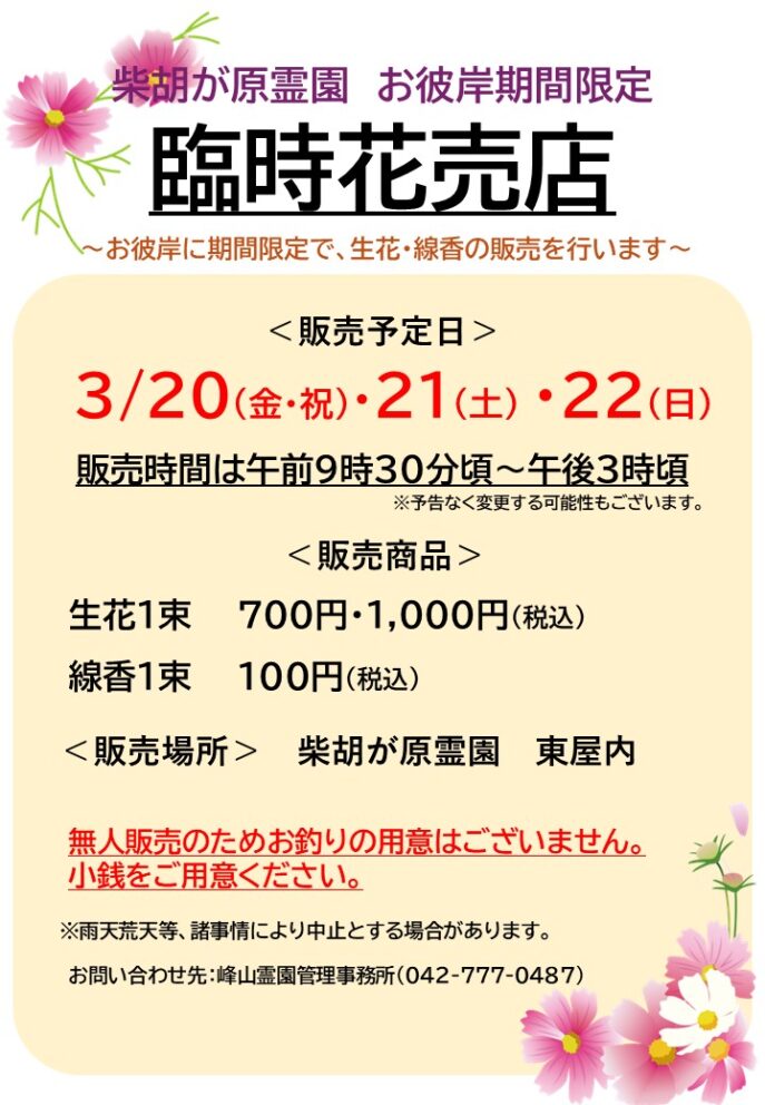 【柴胡が原霊園】令和7年度 春のお彼岸臨時売店に関するご案内